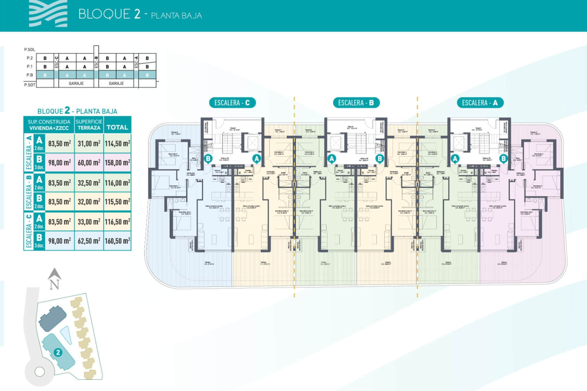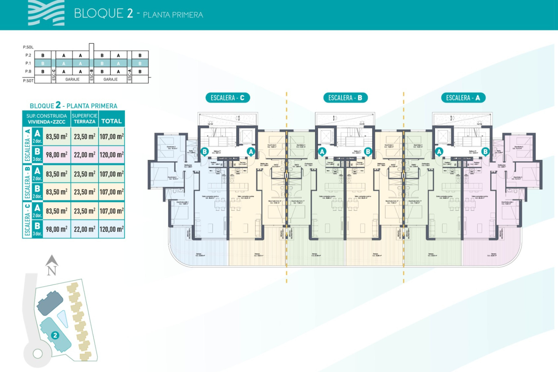 The apartment blocks offer homes with 2 or 3 bedrooms, available on ground and middle floors with large terraces or as penthouses with private solariums.
